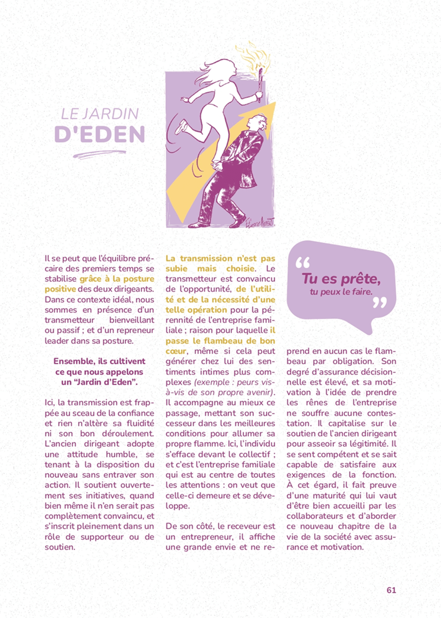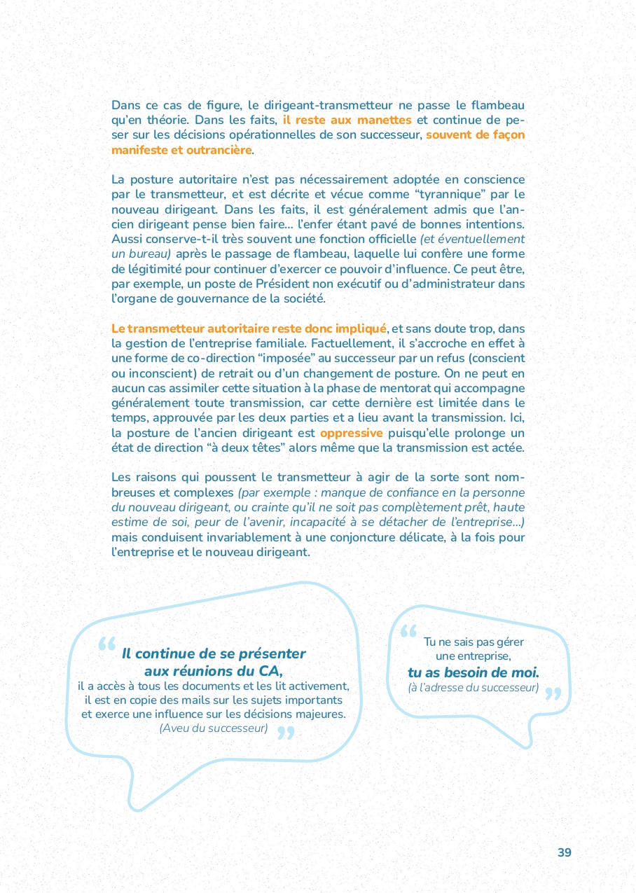 Dans celle-ci, vous découvrirez de nouvelles manières inédites d’adopter les différentes postures qui peuvent être prises lors de la transmission entre deux générations dans les entreprises dont les capitaux sont majoritairement détenus par des familles.